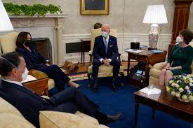 President Joe Biden Meets With White House Staff In The Oval Office Of The White House To Discuss Student Debt.